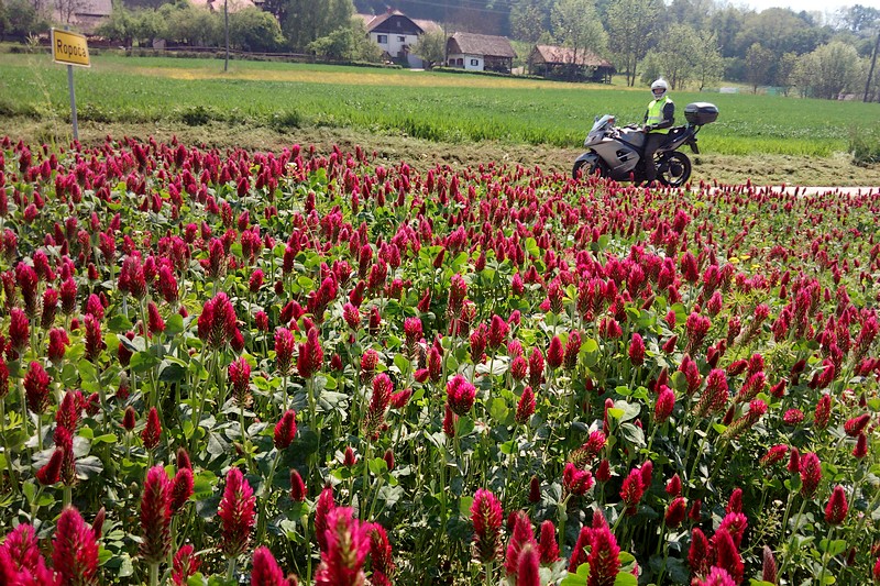 Sva se zadnjič malo peljala z motorjem na naše severne konce. Zelo lepi kraji in kar žal mi je bilo, da naju je vseskozi lovil dež. Tako ni bilo časa veliko stati in vleči fotoaparat iz kovčka. Pa je ratalo nekaj malega s telefonom. Neverjetno je videti takšnole rdeče polje in neverjetno je zabroditi vanj. No, še bolj neverjetno postane, ko te opazi kmet 😉