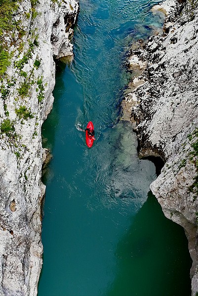 Morda je na tem mestu že vmesen podatek, da še vedno ne veva kje bova prespala. Na Bookingu je bilo čisto vse zasedeno. Od Kranjske Gore do Tolmina. To ne moreš verjet. Kaj takega še nisva videla. Ne! Lažem, ena soba za 375€ je bila prosta. Ja, pa ja de! Se človek vpraša kdo so tisti bogatuni, ki so rezervirali ostale sobe po 375€/noč. Se odpeljeva v samo mestece Kobarid in jaz vidim pri neki oštariji (http://www.kotlar.si/domov.html) napisano v ponudbi tudi »rooms«, se ustaviva in jaz dirkam vprašat, če imajo kakšno prenočišče prosto. Pa mi receptorka reče: «Vas čakamo! Saj ste vi prej klicali na TIC, a ne?« »Jaaaaa … Itak, ja, seveda. A je soba slučajno že naret?« Pa sva se lahko kar namestila, se preoblekla iz usnja v kavbojke in oddirjala proti Napoleonovem mostu. No big dil, razen, da je hudičevo visoko nad Sočo. Pa se midva vseeno ustaviva, moj je spet našel parkirni kotiček, ki kot, da je čakal na naju. Pograbim fotoaparat in jo mahnem na sredo mostu. Lepa zeleno-modra kača se vije pod mano in naenkrat se mi prikaže (fotografska) Marija. Zagledam skupino kajakašev v rdečih in rumenih kajakih, ki se počasi približujejo. Aleluja! Kakšna scena bo to! Enkrat pa le imam tudi jaz srečo. Za ziher jih škljocam še ko so bili še čisto predaleč za res dobro fotko, ko kar naenkrat zagledam napis, ki vsakemu fotografu zledeni kri. Error. WTF! Pa ne zdajle, nooooo. Aparat potisnem v roke mojemu in grabim po žepih za telefonom. Kje hudiča je telefon?! V kovčku na motorju. »Daj ključe! Daj ključe!« kličem mojemu, dirkam z mostu do motorja, mrzlično iščem telefon in dirkam nazaj. In – ravno sem jih še ujela. YES! Resda so slike narejene s telefonom, ampak Huawei Mate9 ima dvojno Leico. Hvala Bogu, zanjo.