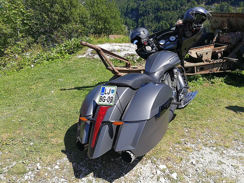 Sončno jutro je, kljub svežini, napovedovalo lep dan. Ponavadi ob takšnih prilikah pozajtrkujeva umešana jajca in spijeva obvezno kavo. Pakiranje ni vzelo veliko časa saj sva šla na pot le za dva dni. Prvi postanek sva imela že za vogalom – nakup vode in odličnih sendvičev v Mesninčku in dvig denarja na bankomatu. Je že res, da je regionalna cesta za motoriste mnogo bolj zabavna kot dirkanje po avtocesti, ampak sva se kljub temu odločila, da greva po njej vse do Logatca. Vedela sva, da naju čaka še več kot dovolj ovinkov. Cesta proti Idriji je neverjetno zoprna in vedno znova se sprašujem, kako ti ubogi ljudje hodijo pozimi v službo. No, pa saj, če je katera cesta zaprta je to Godovič-Idrija. Ampak ta je samo pozimi, čez celo leto pa je definitivno na prvem mestu avtocesta A1. Ampak to je zgodba za kdaj drugič. Pičiva midva čez Idrijo in prvi Oooooo in Iiiiiii se je seveda zaslišal v Mostu na Soči. Ko se pred tabo razlije tista, skoraj nezemeljska, turkizna barva …. Postanek na levem bregu od koder so se mladi kajakaši ravnokar odpravljali na potep, odlična kava, padel je prvi sendvič in prva fotka poslana domačim. Za lušte 😉 Tolmin je čisto blizu, a se nisva ustavljala, saj sva si Tolminska korita že ogledala, za kosilo pa še tudi ni bil čas. Torej, naprej proti Kobaridu. Peljeva po vijugasti strmi cesti na hrib nad njim, kjer si bova ogledala Kostnico (http://kraji.eu/slovenija/italijanska_kostnica_kobarid/slo), in opazujeva turiste, ki jo peš mahajo navzgor. Sonce že prav pošteno pripeka in ni, da bi človek hodil v hrib po soncu in vročini. Revčki, s prospekti v rokah, še ne vedo kaj jih čaka. Veliko parkirno mesto pred Kostnico s cerkvijo nudi celo nekaj malega sence. Za motor se vedno najde kakšen košček. Ogled precej monumentalnega spomenika oz. skupinskega groba več kot 7000 italijanskih vojakov je odprl sam Benito Mussolini. Na eni od tabel je zapisano, da s spomenikom in velikim križevim potom, ki je ob sami cesti, ki vodi na hrib, upravlja italijanska država. Hmm, je to običajno?