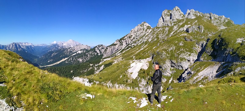 Vreme čudovito, skoraj vroče kljub višini, nebo modro in prav nikjer nobene zaplate snega. Po kakšni urci občudovanja, fotkanja (nisem našla gamsov in kozorogov, zato pa je bilo kar nekaj ovc) in razgledov, poležavanja na travi, ko mi je že skoraj uspelo mojega prepričat, da se povzpneva višje, peš, daj, no… sva dokončala sendvič, spila vodo in se odpravila v dolino. Mislim, da bi moral tisti prijazni gospod, ki spušča vozila noter, šteti koliko jih gre noter in predvsem koliko ven, ker gneča je postajala skrajno nadležna. Cesta pa prekleto ozka in prepadi zelo konkretni. Še sreča, da ima moj dobro intuicijo in je predvideval za katerim ovinkom se bo na najini strani znašel kakšen prestrašen voznik s prevelikim mestnim terencem.