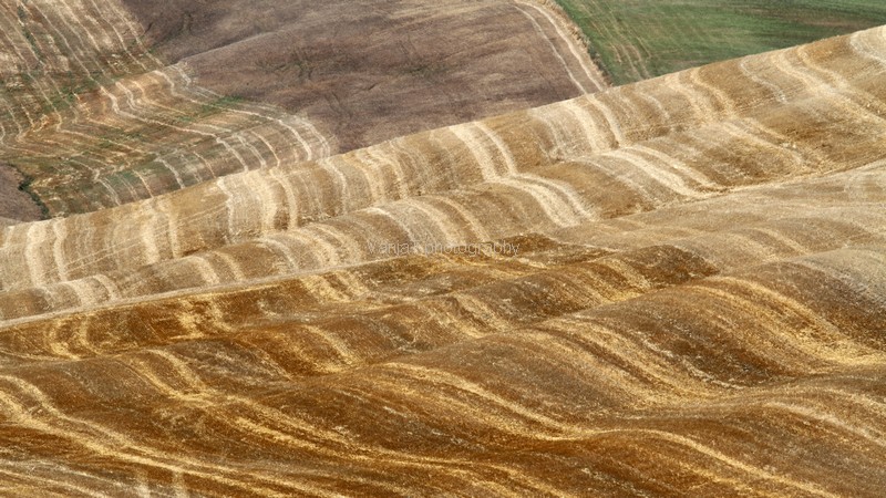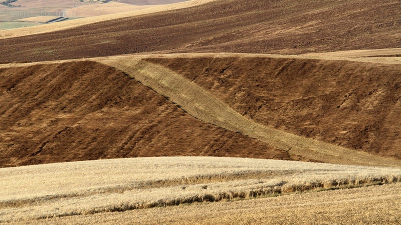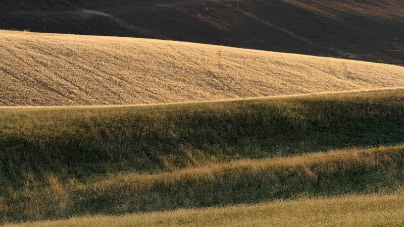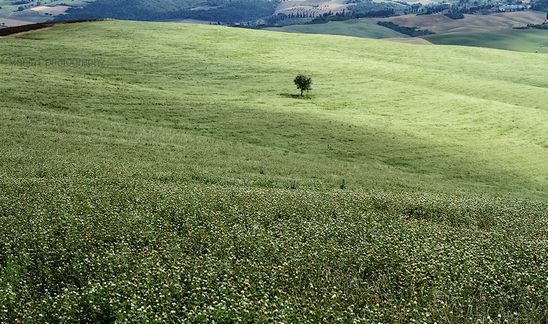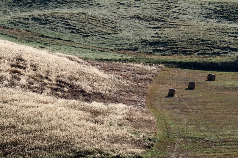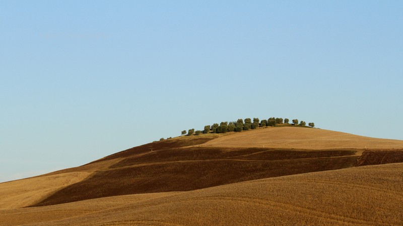 Linije in ploskve so bile neverjetne. Pri njih so tiste dni že želi in ustvarjali nore vzorce rumenih in rjavih odtenkov. Nebo je žarelo in po njem so se preganjale bele ovčke. včasih se mi je zazdelo, da so meje polj zanalašč tako atraktivno speljane in tista drevesa zanalašč zasajena tam, kjer so. Italijani pač 😉
