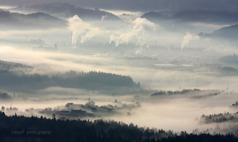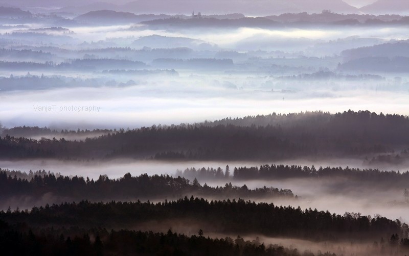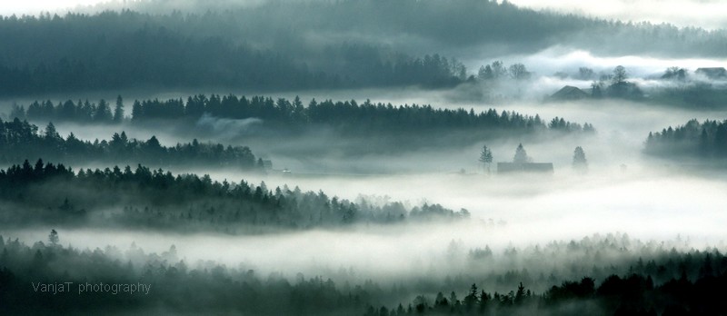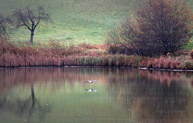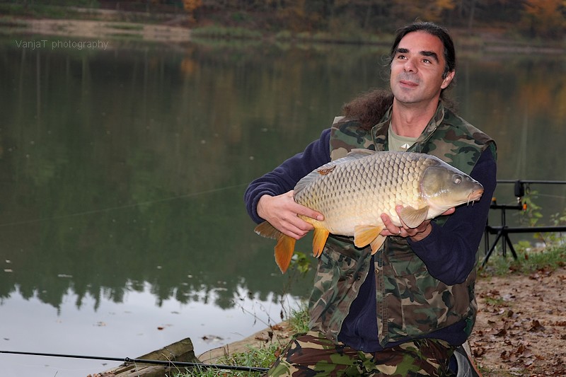 Danes me je jutro potegnilo vase in  ni bilo pomoči. Oddirjala sem na hrib in vdihnila osupljivo jutro v zadnje delčke pljuč. Meglice so bile tiste stare znanke, ki me ponavadi ne puste na cedilu, sonce pa se je le sramežljivo pokazalo na samem začetku, potem pa se skrilo za oblake. Noro nevarna cesta polna mokrega jesenskega listja je bila kriva, da sem morala, več kot enkrat, obstati na klancu, dati v prvo in, ob drsenju gum v prazno, pazljivo speljati. Oblak smradu po zažganem je verjetno spravil v slabo voljo tudi gospe, ki sta v družbi simpatičnega galga, pripešačili po poti. Ampak meni se je mudilo. Zopet fotografirati na starih mestih, plezati preko ograje, da prideš do tistega top of the top mesta za fotografiranje, me je poživilo bolj kot skodelica kave. Po še bolj nevarni poti sem se po centimetrih spuščala v dolino in upala, da mi nasproti ne pripelje kakšna "Vanja". Pa je na križišču srce zavilo še proti ribiškem domu, kjer sem srečala tri ribiče, z opremo, ki je bila garant več vredna, kot moj avto. Prijazni gospodje so se na jutranjo ribičijo pripeljali z Jesenic! Menda, da to še ni nič, ker gredo lovit tudi 500 km daleč, če se jim zahoče. Ponudili so mi božansko kavo in kratkega, a na prazen želodec je bila kava ravno prav. Kako resno jemljejo svoje delo lahko vidite v očeh ribiča, ki je ravno takrat ujel skoraj 7 kilogramskega krapa. Ga najprej lepo pobožal, po tehtanju pa ga nadvse nežno spustil nazaj v jezero.