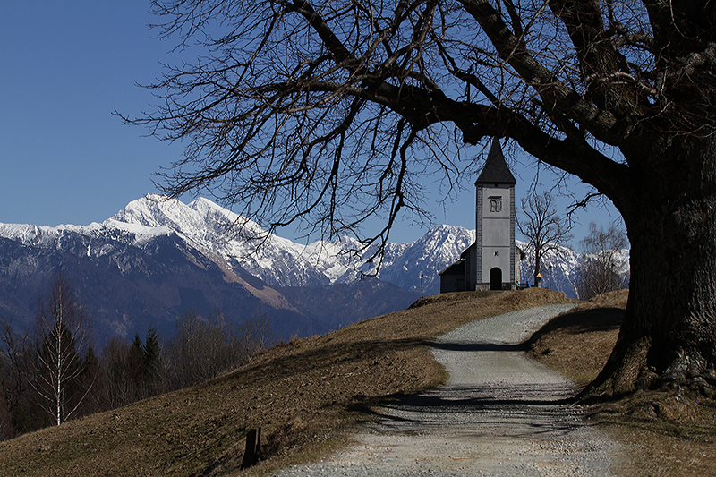 Greva midva na Gorenjsko nekaj iskat, sediva na kavici in se pogovarjava s človekom, ko moj pogled nenadoma uzre hrib. In na njem cerkev. Pa ob njem drevo. Več dreves. Resnično nič posebnega v Sloveniji, kjer ima vsak hrib svojo cerkvico. Ko v meni naenkrat nastane nemir in kar sredi pogovora butnem: "A je to Jamnik?" Jaaaaaaa. Evo, čisto po butastem sem danes prišla tja gor kjer se ti orosi oko in ti srece reče:"Madona imamo lepo deželo."