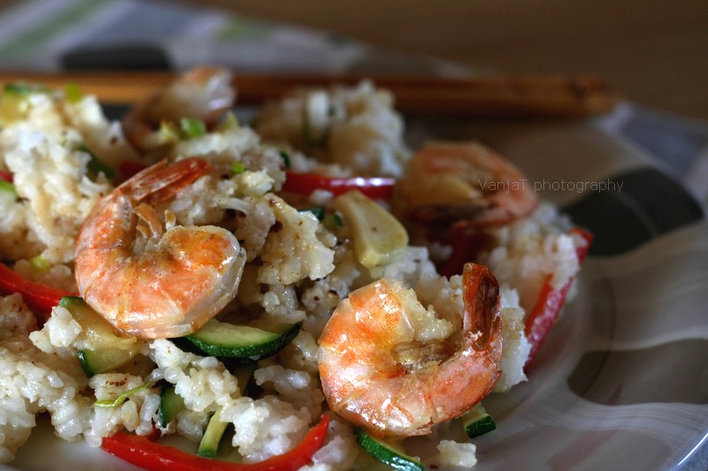 Priznajte, da bi tole z veseljem pospravili 🙂 Riž, bučke, ingver, rdeča paprika, česen, rakci, sojina omaka – jamii…